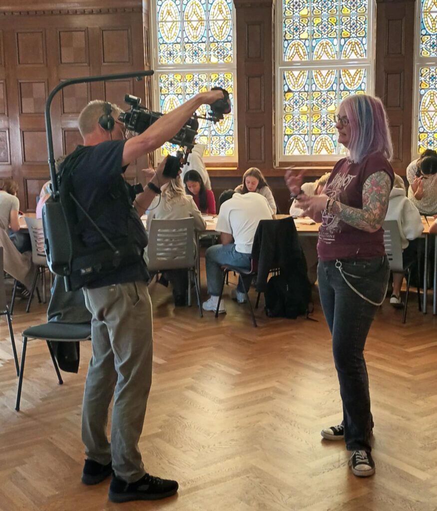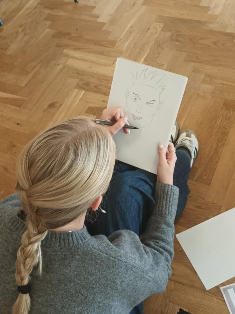 Underviseren denne dag er Tatiana Goldberg, der bl.a. arbejder med at tegne og illustrere tegneserier. Den opmærksomme seer vil måske have opdaget et kamera på et af billederne… Vi fik nemlig også besøg af TVSyd, så hold øje med dit tv og se hvad vores elever og Tatiana fik ud af dagen